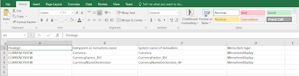 Below is the code snippet of it. The code will extract the list of all menu items which are covered under privilege 'CurrencyView' and it will export data in excel sheet. The excel sheet will contain following information :